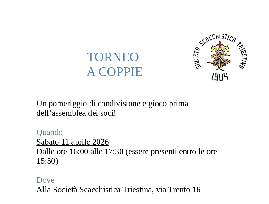 Sabato 11 aprile presso la nostra sede in via Trento 16 vi sarà un torneo blitz a tempo 3+2 in cui si sfideranno coppie sorteggiate appena prima del torneo. L’iscrizione è gratuita!